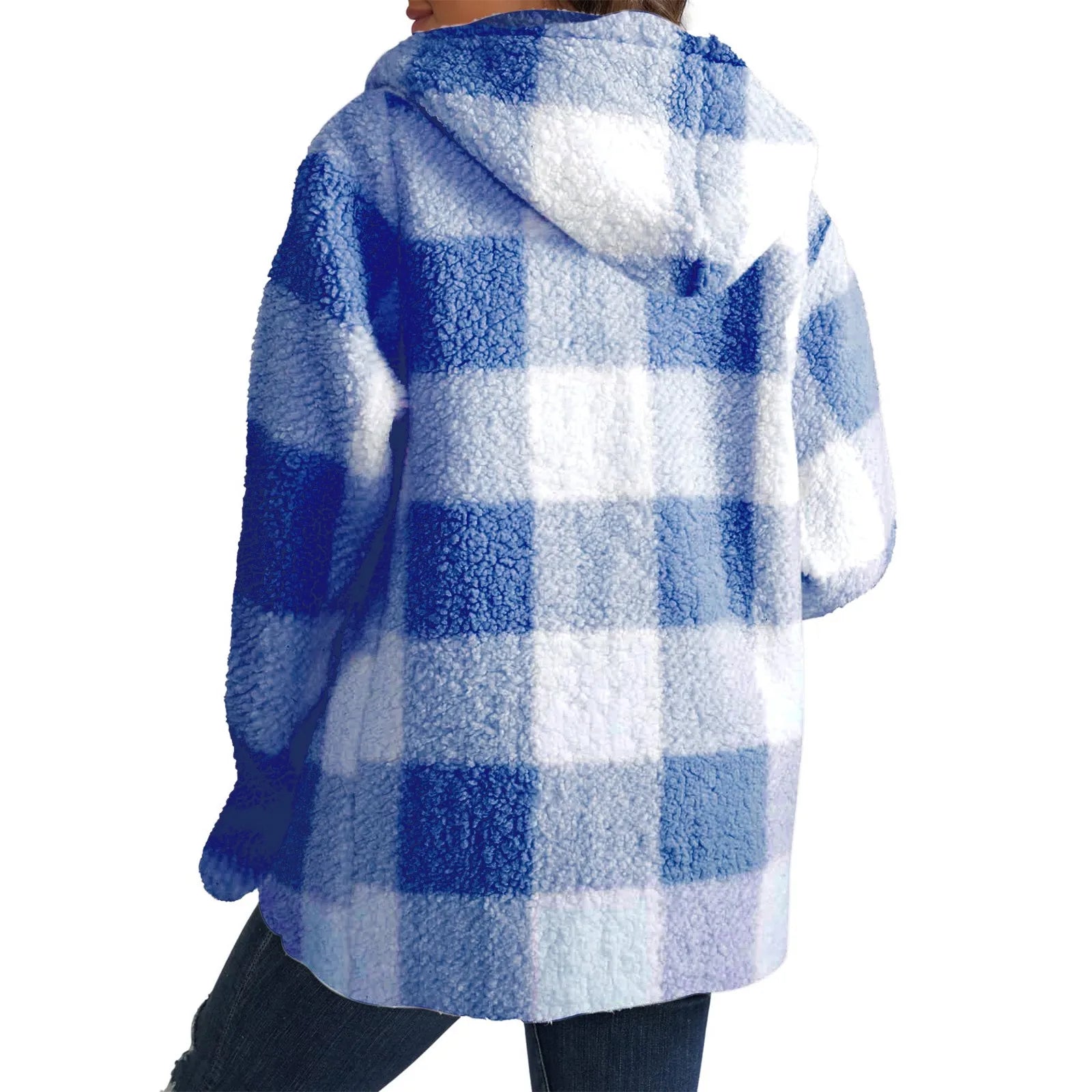 Loose Long Sleeve Plush Plaid Hooded Pocket Zipper Jacket Fashion Winter Warm Fuzzy Cardigan For Female